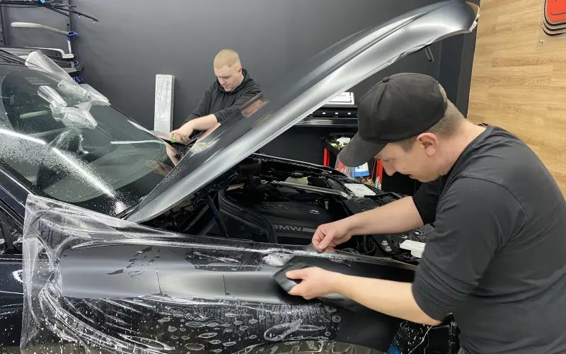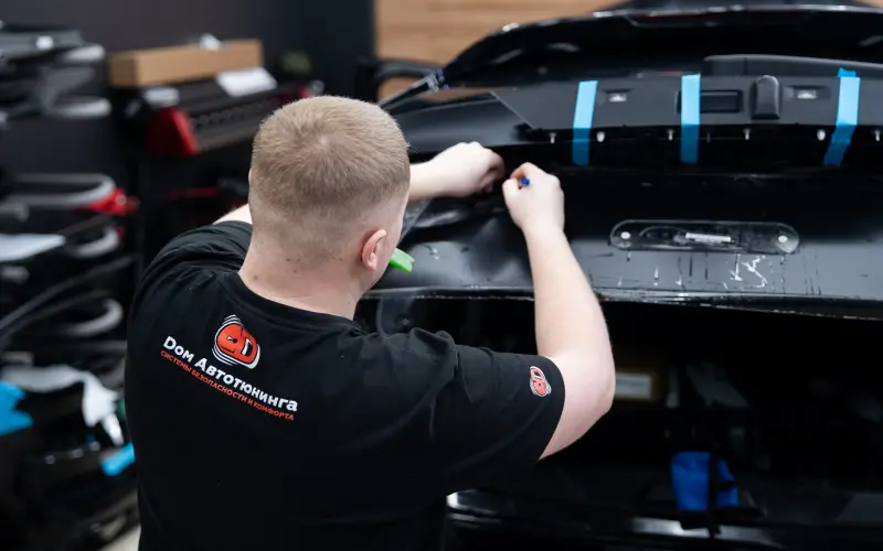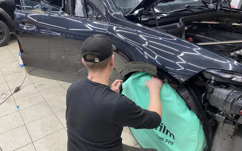 Зачем? Чтобы завернуть края материала, обеспечить идеальную стыковку и гарантировать, что ни один уголок не отклеится даже через годы эксплуатации. Особенности кузова X7 — обилие острых граней и глубоких рельефов — были не проблемой, а возможностью блеснуть мастерством.