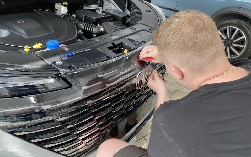 пленка раскраивается вручную по лекалам кузова. С помощью монтажного раствора и термофена материал точно наносится на поверхность, повторяя каждый изгиб. Особое внимание уделили зоне решетки радиатора и сложным граням бампера.