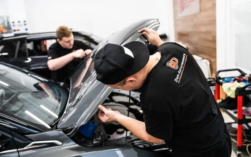 Процесс оклейки включал несколько этапов. Мы демонтировали бампер и некоторые элементы для идеального заворота краев, тщательно подготовили поверхности и выполнили точный раскрой материала. Каждый этап контролировался на соответствие стандартам качества.