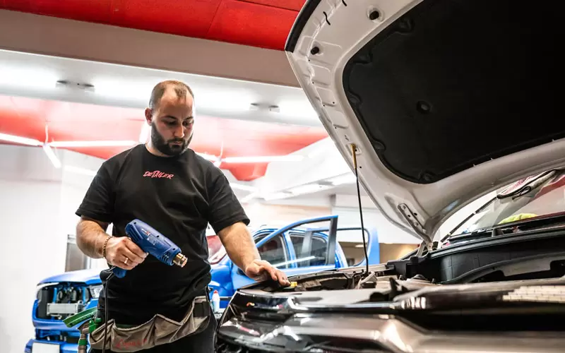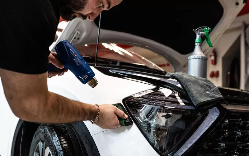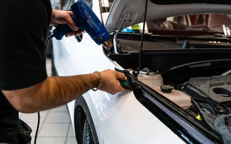 Нанесение пленки: с помощью термофена мы аккуратно разогревали пленку, чтобы она становилась более податливой. Это позволило нам без проблем загибать ее на края и сложные участки.