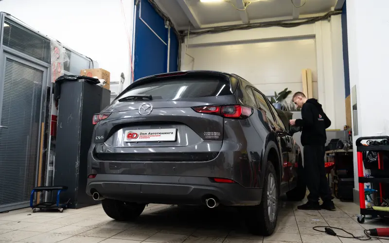 Процесс оклейки плёнкой Mazda требует точности. Для этого автомобиля мы демонтировали передний бампер, фары и зеркала. Такой подход позволяет: