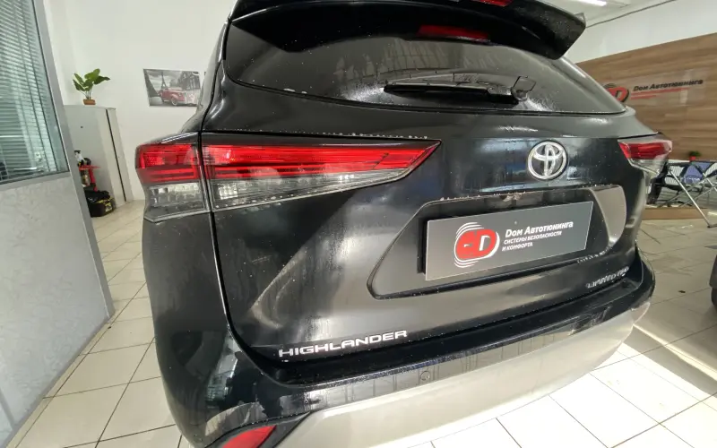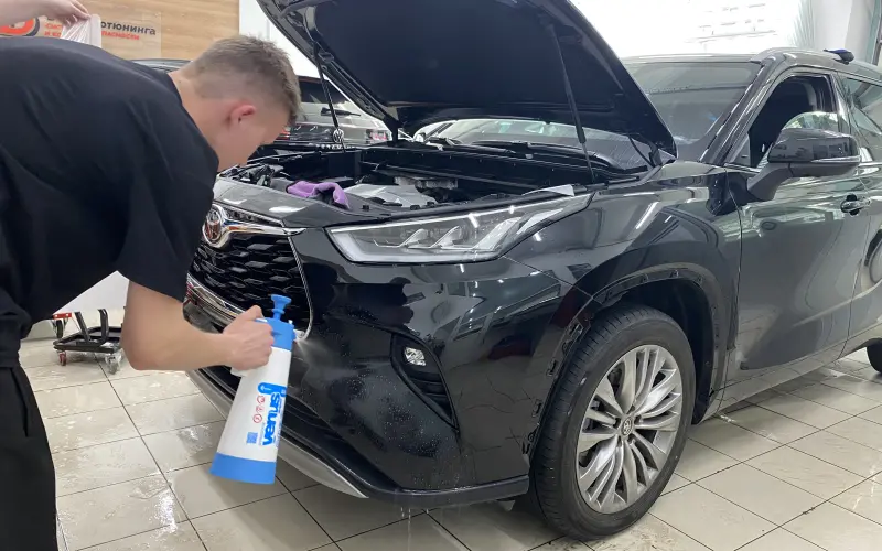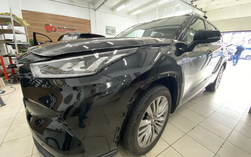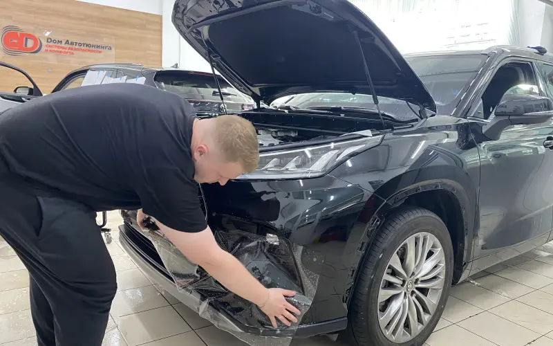 Toyota Highlander имеет сложные изгибы кузова, особенно в зоне бампера и стоек лобового стекла. Наши мастера учли эти особенности, чтобы покрытие легло идеально.