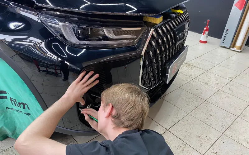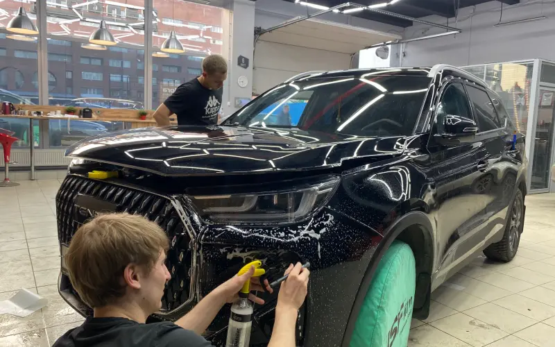 TENET T7 — автомобиль с элегантным, но сложным для оклейки дизайном. Острые грани, глубокие выштамповки и сложная оптика. Для нас это не проблема, а задача, которую мы решаем с хирургической точностью.