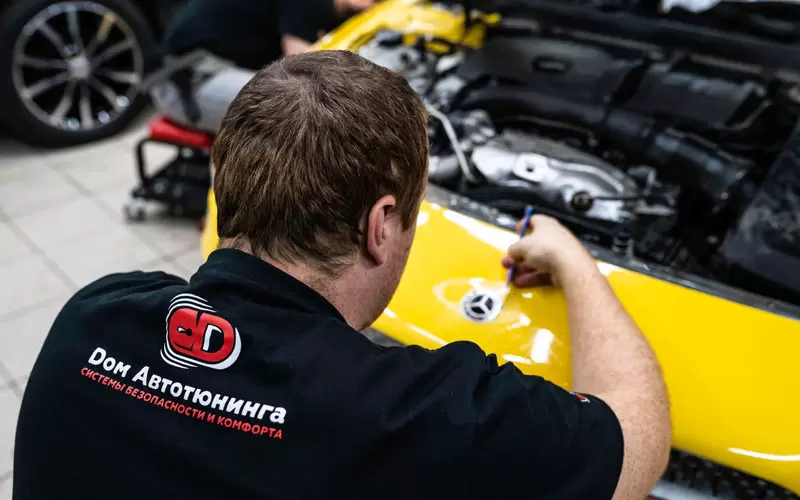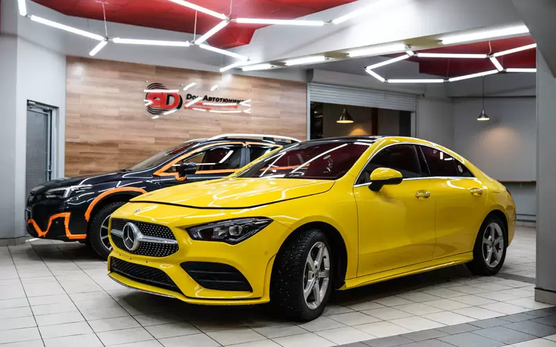 В нашей студии «Дом Автотюнинга» мы завершили интересный и технически сложный проект — полную оклейку Mercedes CLA в красивом жёлтом цвете прозрачной антигравийной пленкой. Этот автомобиль привлёк наше внимание своим ярким дизайном, и мы решили, что защита его кузова должна быть не только надёжной, но и незаметной, чтобы сохранить первоначальный внешний вид.