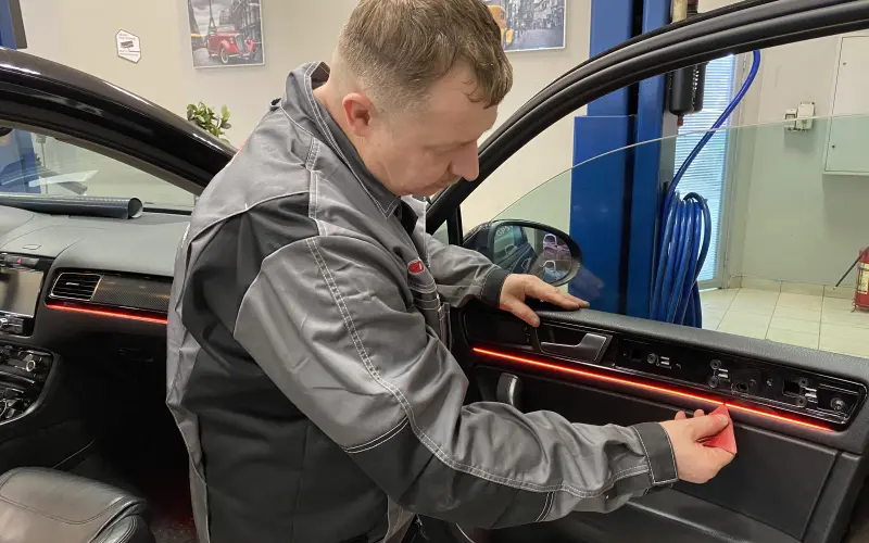 Время установки зависит от сложности работы и количества элементов. Например, монтаж одного элемента занимает около 2 часов. Комплексная подсветка, включающая двери, консоль и зоны ног, может занять 7–10 часов. Мы работаем аккуратно, без спешки, чтобы результат был идеальным.