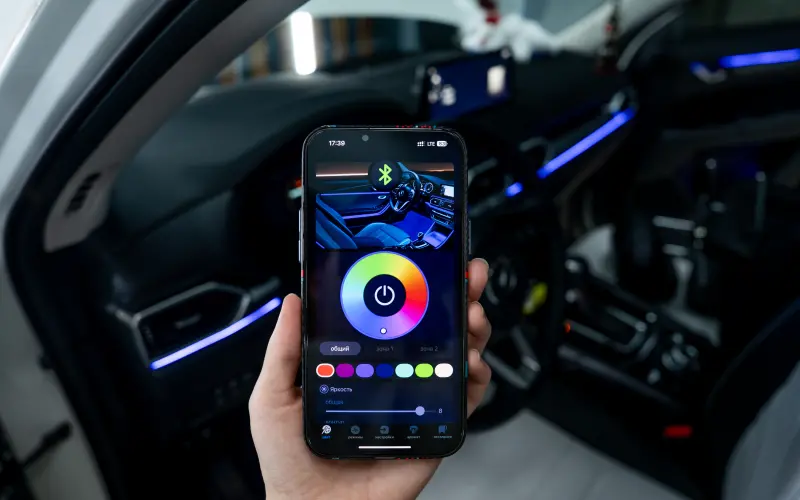 Работа началась с демонтажа обивки дверей и центральной консоли. Главная задача — незаметный монтаж. Мы тщательно прокладывали проводку по штатным каналам, избегая перегибов и несостыковок с другими системами авто. Основная сложность — идеально зафиксировать светодиодные ленты без перекосов, чтобы свечение было ровным по всей длине, без «горящих точек». Наши мастера использовали специальный клей и крепления, а для питания аккуратно интегрировались в штатную электросеть через предохранители с диодной изоляцией.