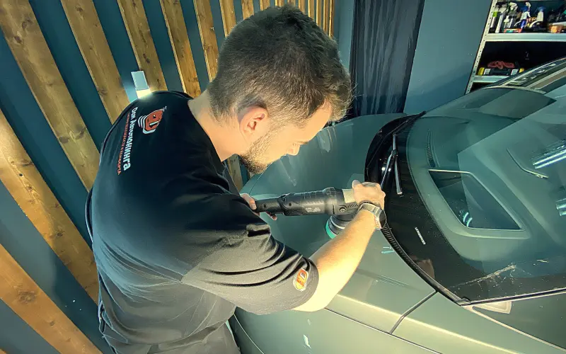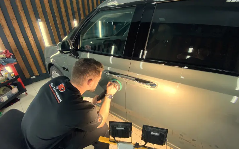 Это самый важный этап. Два наших мастера вручную, на профессиональном оборудовании и с использованием качественных немецких полировальных паст, выравнивали лакокрасочное покрытие. Мы действовали крайне аккуратно, ведь наша цель — не просто убрать дефекты, а сохранить максимальное количество заводского лака. Полировка ZEEKR 009 была выполнена в несколько этапов для идеального глянца.