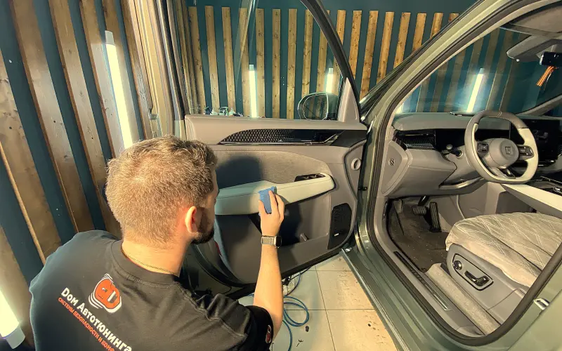 Мы не забыли и про просьбу клиента. Все кожаные элементы салона этого ZEEKR были тщательно очищены и обработаны специальным керамическим составом для кожи. Теперь они надежно защищены от пролитых напитков, жирных пятен и выцветания.