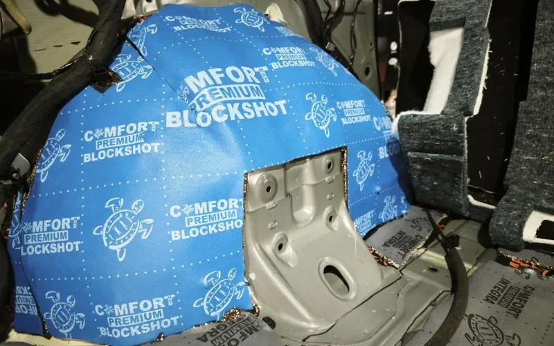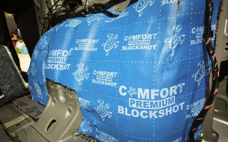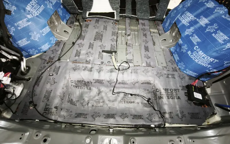 Мы не просто клеим «шумку», мы создаём многослойный барьер. На пол в качестве вибропоглотителя легла серьёзная виброизоляция Вайпер. Её главное оружие — тяжелый, пластичный битумно-полимерный слой с высоким содержанием каучука, который гасит резонанс металла, не боится температурных перепадов и обладает феноменальной адгезией.