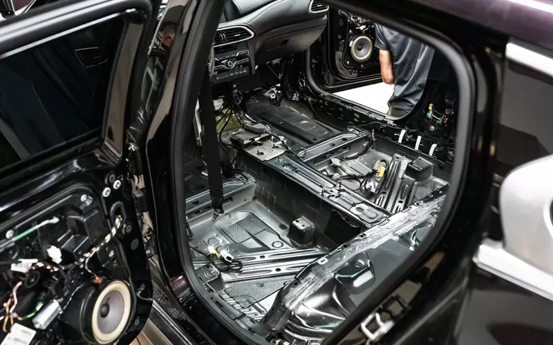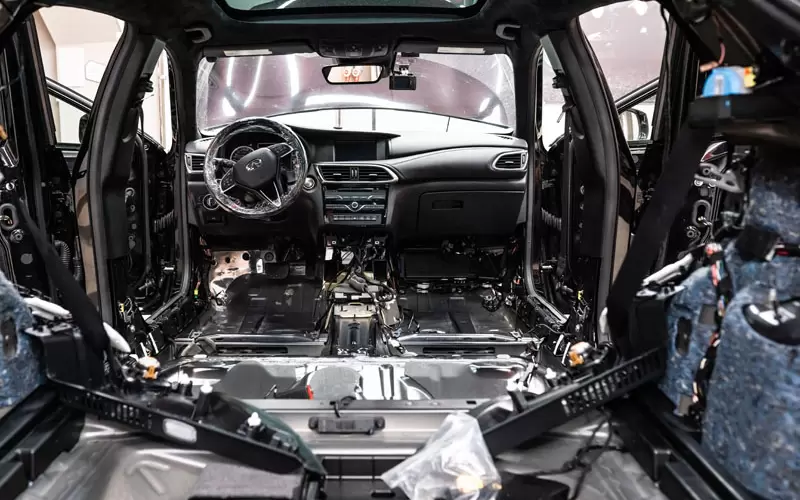 Мы выполнили полную шумоизоляцию Инфинити QX50, используя материал STP AeroCell. Процесс включал следующие этапы: